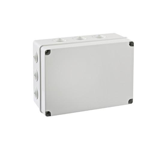 La IDE CAJA DE DERIVACIÓN IP65 253x342x132 es una solución robusta y fiable diseñada para proteger componentes eléctricos en entornos exigentes. Con una estructura de dimensiones exteriores de 253x342x132 mm, cuenta con una tapa opaca que asegura el bloqueo de la luz y la protección contra impactos y agentes externos, gracias a su grado de protección IP65. Está fabricada con materiales plásticos libres de halógenos, con base y tapa en PS antichoque y conos de PVC, garantizando durabilidad y resistencia a diferentes condiciones ambientales. La caja está diseñada para una instalación en superficie, mediante 12 entradas de cable con roscas M40, facilitando su integración en diferentes proyectos eléctricos y de automatización. Con un peso ligero de 0,92 kg, es fácil de manipular y montar, lo que la hace ideal para aplicaciones en industria, construcción y sistemas de distribución eléctrica.