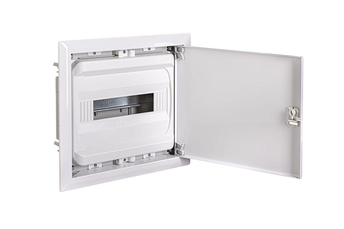 La IDE CAJA DISTRIBUCIÓN IP40 EMPOTRAR PARED HUECA 1×14 MÓD. PUERTA METÁLICA es una caja de distribución diseñada específicamente para empotrar en paredes huecas, ofreciendo protección y organización excelente en instalaciones eléctricas. Con unas dimensiones exteriores de 337x387x97 mm y un hueco de empotrar de 304x354x87 mm, esta caja permite alojar 14 módulos, facilitando una distribución eficiente de cables y componentes electrónicos. La puerta metálica en chapa de 0,8 mm de acero laminado en frío garantiza una protección robusta, mientras que la tapa frontal en PS blanco y la base en RAL 7035 aportan un acabado estético y duradero. Su peso de 2,67 kg y la entrada de cables en 2xM25, 1xM32 y 1xM40, la convierten en una solución accesible y funcional para instalaciones profesionales. Además, su construcción en materiales plásticos libres de halógenos asegura una mayor seguridad en caso de incendio y resistencia al impacto IK08, soportando impactos severos y condiciones adversas.