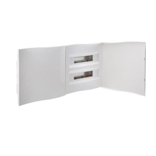 La caja de distribución IP40 empotrada en paredes huecas modelo DFF72PO/PH destaca por su robustez y amplia capacidad, diseñada en materiales plásticos libres de halógenos como el poliestireno (PS V0). Sus dimensiones exteriores horizontales de 380x851x105 mm y verticales de 746x424x105 mm facilitan una integración versátil en diferentes entornos. Con un espacio interno para módulos de 36+36 unidades, permite organizar componentes eléctricos de manera efectiva, garantizando protección y accesibilidad adecuada para instalaciones complejas en edificios residenciales o comerciales. La estructura cuenta con una ventana opaca para protección adicional, cumpliendo con el grado de protección IP40, que protege contra objetos sólidos y contactos accidentales.