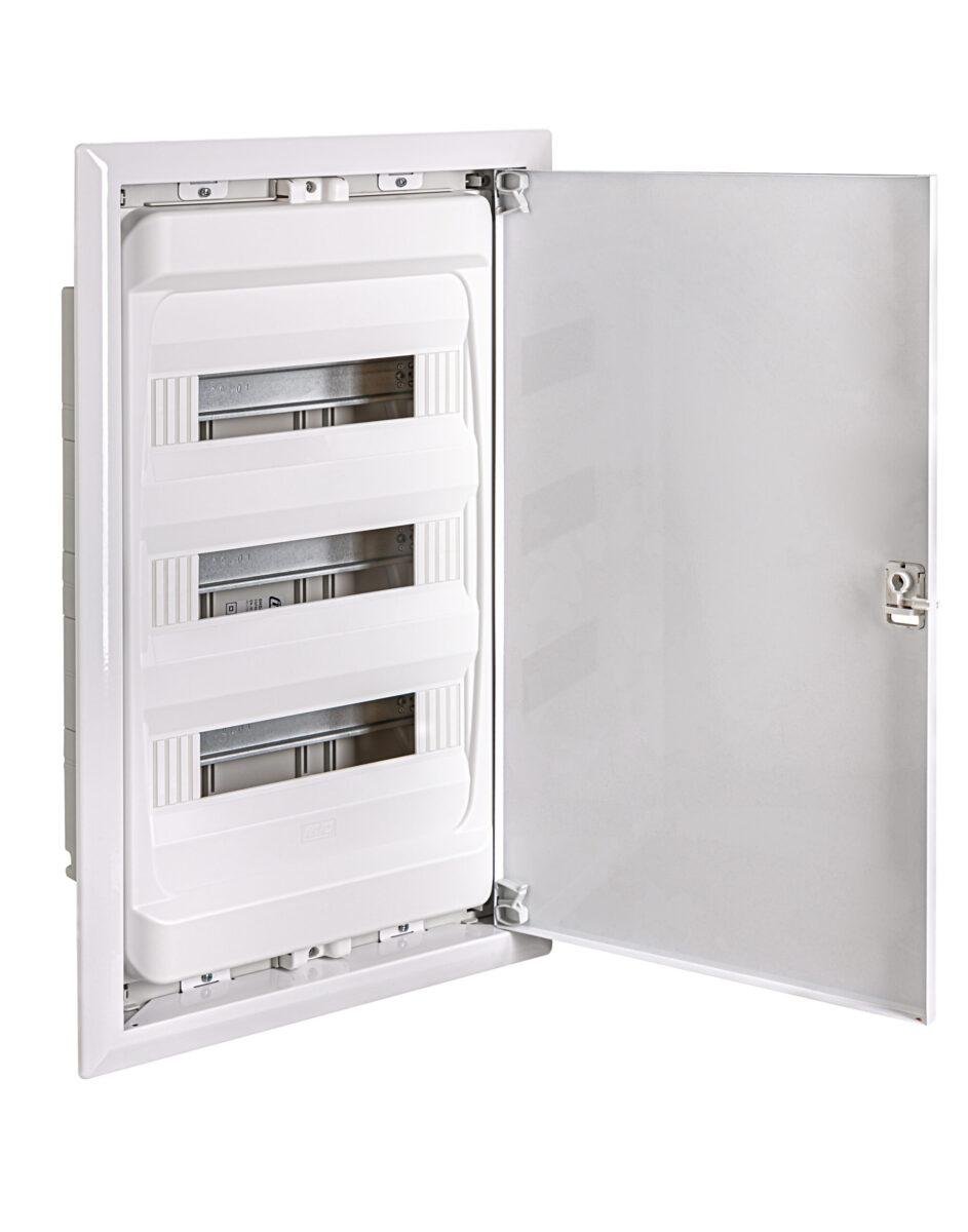 La caja de distribución IP40 empotrada en pared, modelo GME42PO, combina robustez y protección avanzada para instalaciones eléctricas residenciales y comerciales. Con unas dimensiones exteriores de 627x387x99 mm y un hueco de empotrar de 592x352x89 mm, esta caja soporta hasta 42 módulos, ofreciendo una solución eficiente para organizar y proteger elementos eléctricos en espacios convencionales. Fabricada con materiales plásticos libres de halógenos y una puerta metálica de chapa de 0,8 mm, garantiza resistencia a impactos, protección IP40 y resistencia al hilo incandescente, asegurando la integridad del sistema eléctrico ante condiciones exigentes. La puerta y tapa frontal en color RAL 9003, junto con la base de empotrar y los bastidores en RAL 7035, ofrecen una estética profesional y duradera. Con un peso de 4,61 kg y facilidades para cableado de entrada en varias opciones (2x [2x M25, 1x M32, 1x M40]), es una opción versátil para diferentes configuraciones de instalación.