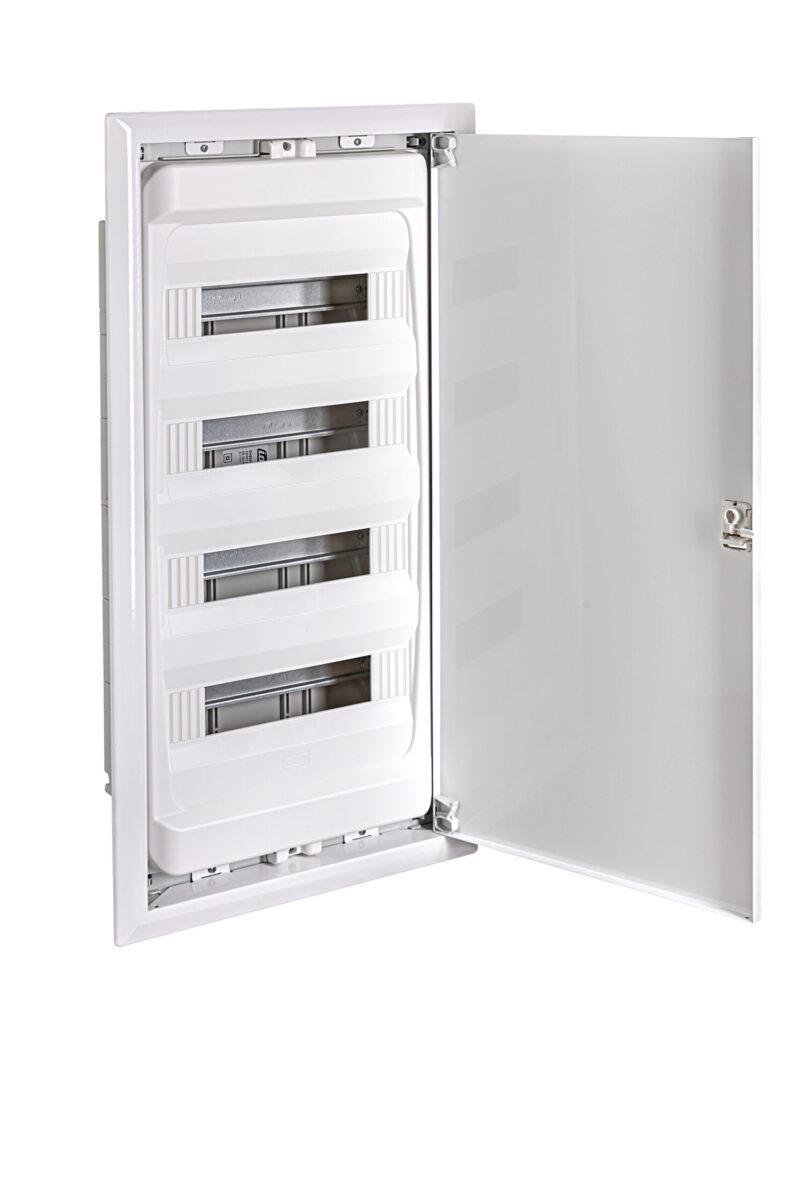 La Caja de distribución IP40 empotrada en pared, con capacidad para 56 módulos, ofrece una solución robusta y confiable para la protección y organización de componentes eléctricos en instalaciones convencionales. Con dimensiones exteriores de 725x387x99 mm y un hueco de empotrar de 717x352x89 mm, permite una integración sencilla en diversos entornos, garantizando durabilidad y protección gracias a su puerta metálica de 0,8 mm en chapa de acero laminado en frío y componentes libres de halógenos.