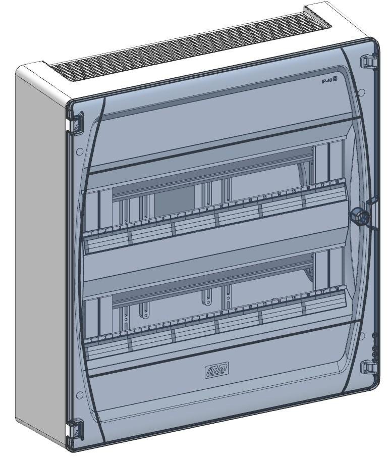 IDE CAJA DISTRIBUCIÓN IP40 SUPERFICIE 2×18 (36) MÓDULOS PUERTA TRANSPARENTE para una distribución eléctrica segura y eficiente