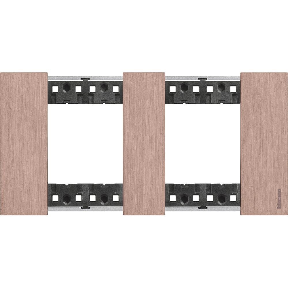 Gracias a su marco móvil flexible fijado en la parte trasera, la placa Living Now asegura una instalación sencilla y alineada, incluso en superficies irregulares. Se recomienda usar soportes Bticino con tornillos ref.K4702 y cajas de empotrar universales Batibox, compatible con diferentes tipos de tabiques huecos o de albañilería. La compatibilidad con sistemas de montaje específicos permite una colocación perfecta, evitando arañazos o manchas que puedan comprometer el acabado final. Además, su diseño compacto de 2 módulos y sus acabados en cobre cepillado aportan un toque de sofisticación a cualquier espacio interior.