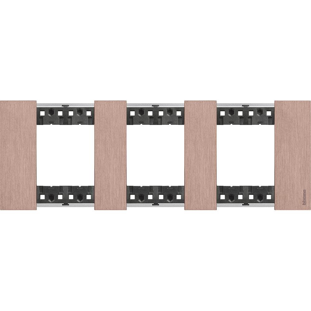 Gracias a su marco flotante flexible, la placa Living Now permite una instalación sencilla y precisa, ajustándose perfectamente a las cajas de empotrar universales y al sistema de soportes BTicino con tornillos ref.K4702. La fijación en la parte trasera, combinada con su diseño compacto y líneas únicas, asegura que los mecanismos queden alineados y a ras en la pared, eliminando arañazos y manchas durante el proceso de montaje. Además, la placa se provee en un embalaje específico que protege el acabado cobre, garantizando su integridad hasta el momento de la instalación, lo que la hace ideal para espacios interiores que requieren estética y funcionalidad.