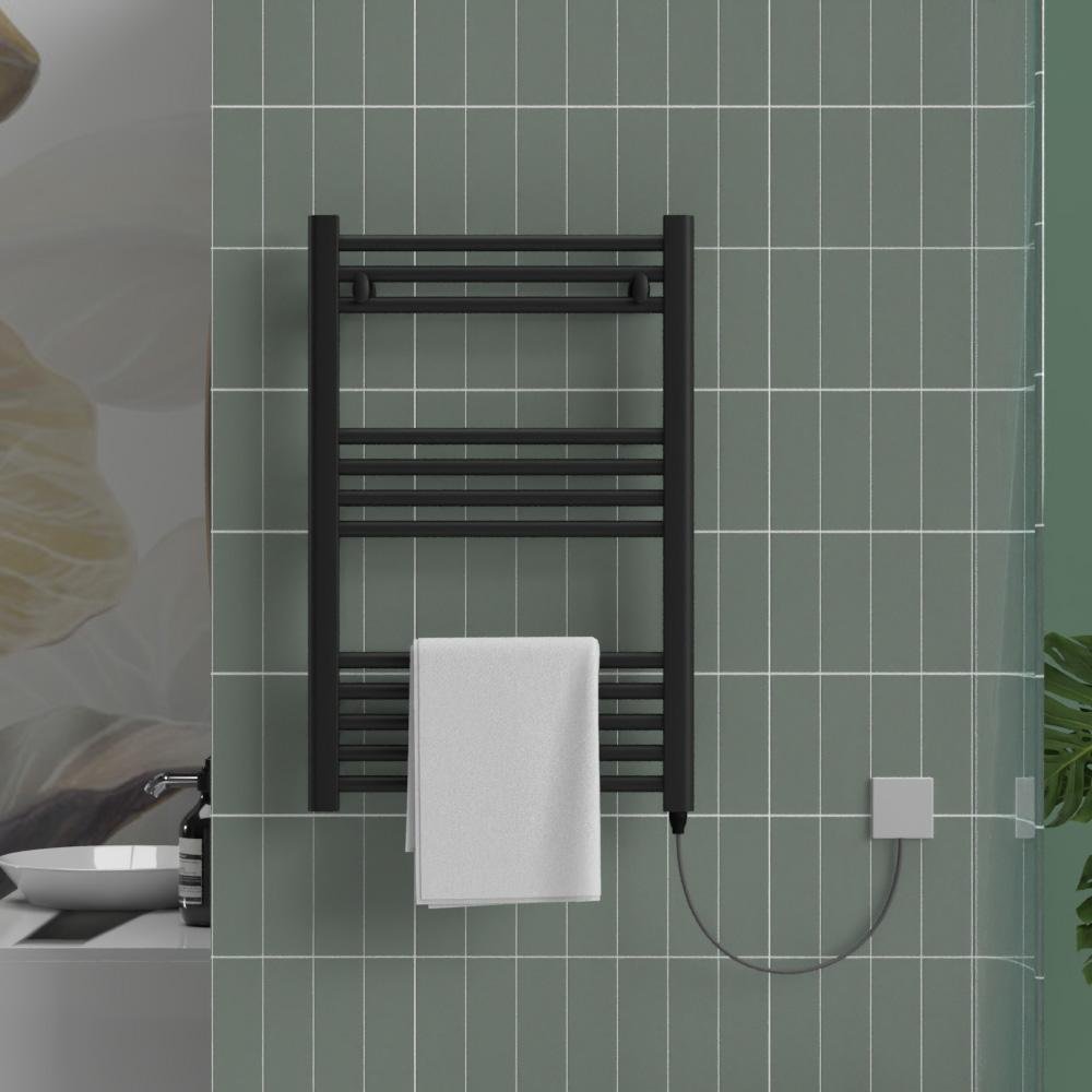 Diseñado para áreas de hasta 3 m², este toallero eléctrico combina potencia y durabilidad con un acabado negro elegante que aportará un toque moderno a cualquier baño. Su potencia nominal de 300W, distribuida en 12 tubos, proporciona suficiente calor para secar toallas y prendas de manera rápida y segura. La estructura de acero con termo-fluido lleno de aceite permite una transferencia térmica elevada, asegurando un funcionamiento eficiente y homogéneo. Gracias a su peso compacto y dimensiones de 500 mm de ancho por 810 mm de alto y 30 mm de profundidad, la instalación en pared resulta sencilla y rápida, optimizando el espacio. Además, su compatibilidad con diferentes sistemas de control y su protección IP44 lo convierten en una opción confiable para ambientes húmedos, contribuyendo a un uso responsable con energías renovables, promoviendo la calefacción ecológica y sostenible.