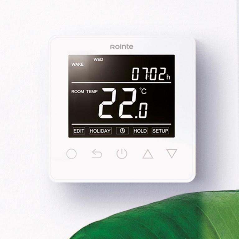 El Termostato digital programable Rointe ST.3 ha sido diseñado para ofrecerte una gestión avanzada de tu sistema de calefacción por suelo radiante eléctrico. Con una potencia máxima admisible de 3.680 W (16 A), este dispositivo compacto presenta una pantalla LCD táctil de 63 × 49 mm que facilita una interfaz intuitiva. Incluye una sonda de temperatura ambiente integrada y una sonda de suelo NTC de 3 m, con sensibilidad de 10 kOhm a 25 ºC, que garantizan una regulación precisa de la temperatura, adaptándose a diferentes necesidades y rutinas de calefacción.